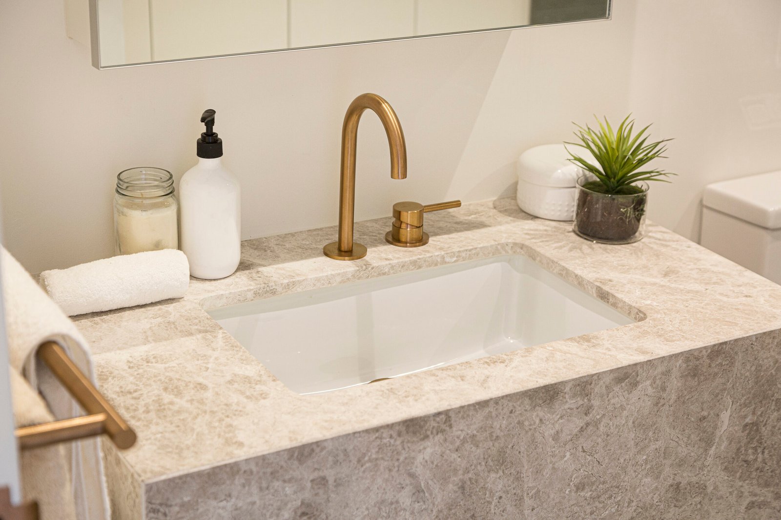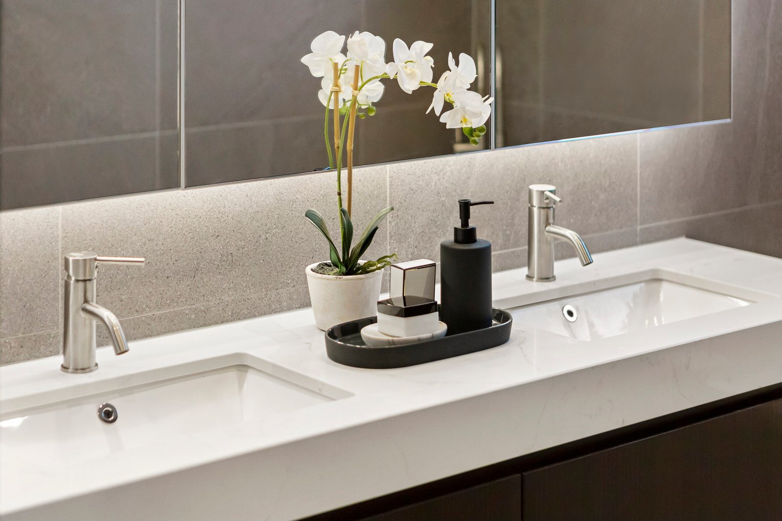 Quartz, marble, granite, and porcelain are ideal surfaces for bathrooms—combining moisture resistance, durability, and timeless style. Their non-porous or sealed finishes help prevent water stains, mould, and mildew, making them perfect for vanities, sinks, and wet areas that demand daily use.
