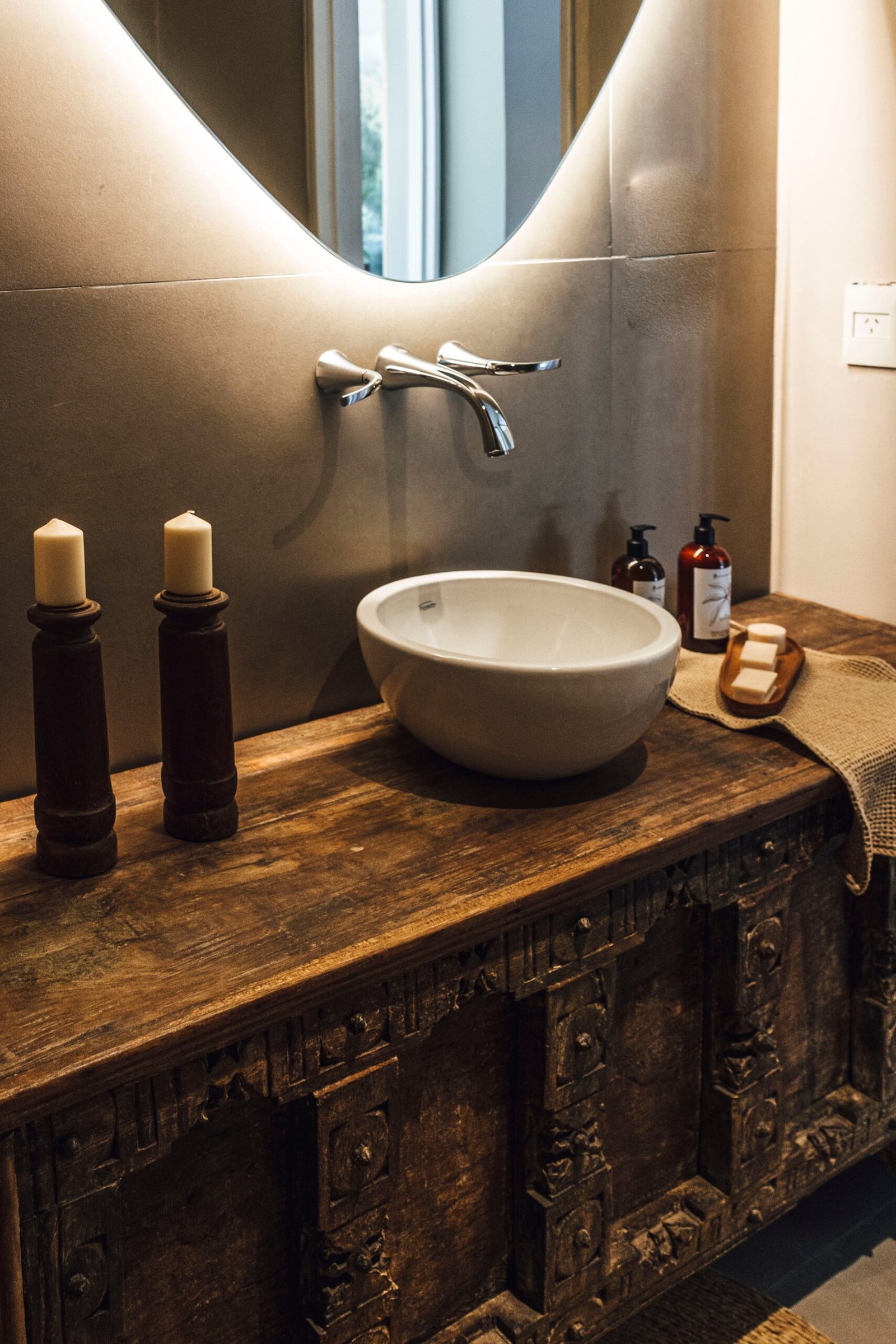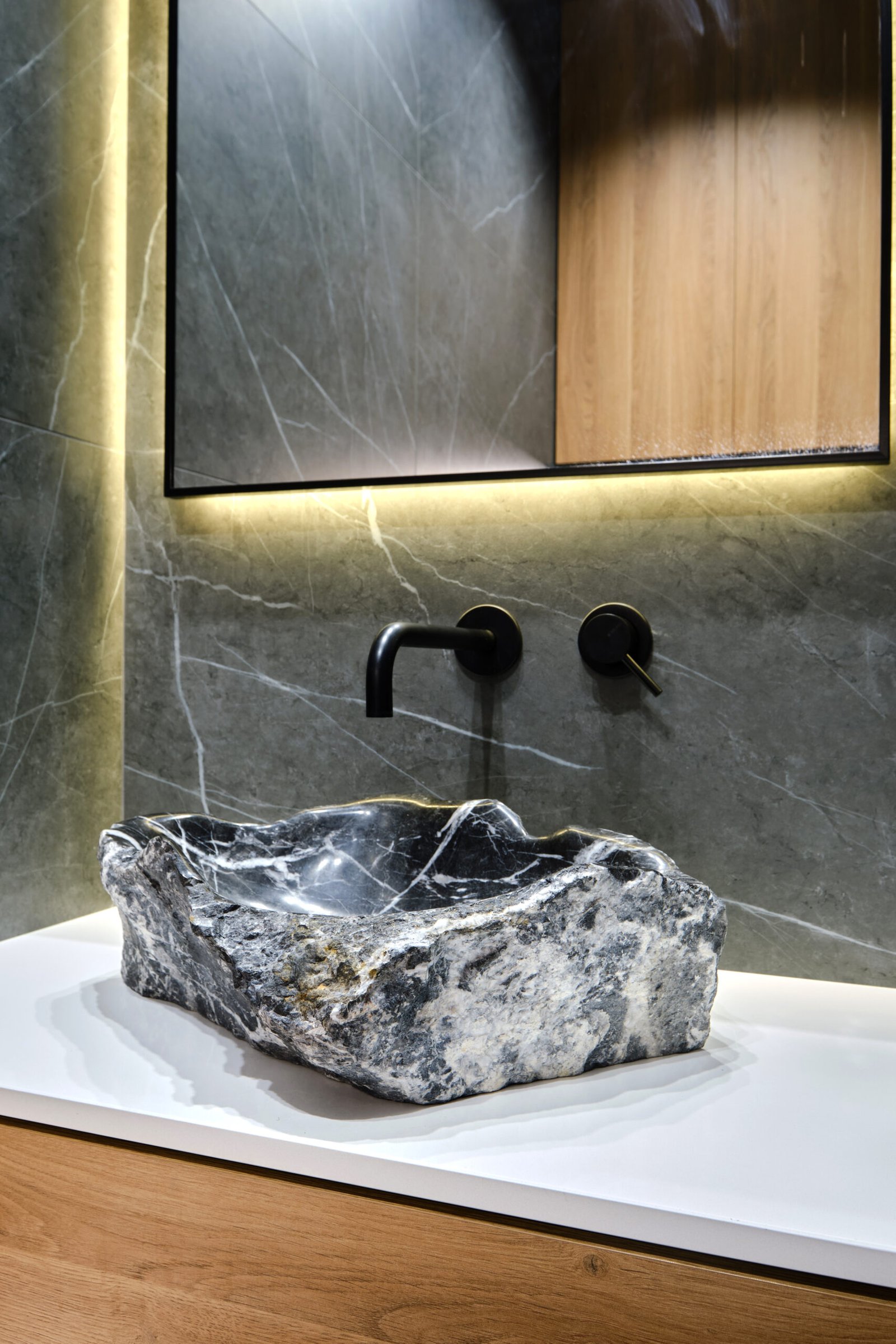 A unique stone sink made from natural rock rests on a sleek countertop in a modern bathroom. Soft lighting highlights the textures of the sink and complements the minimal decor and wooden elements.